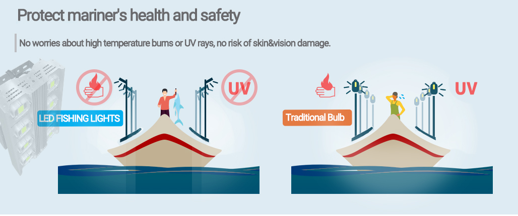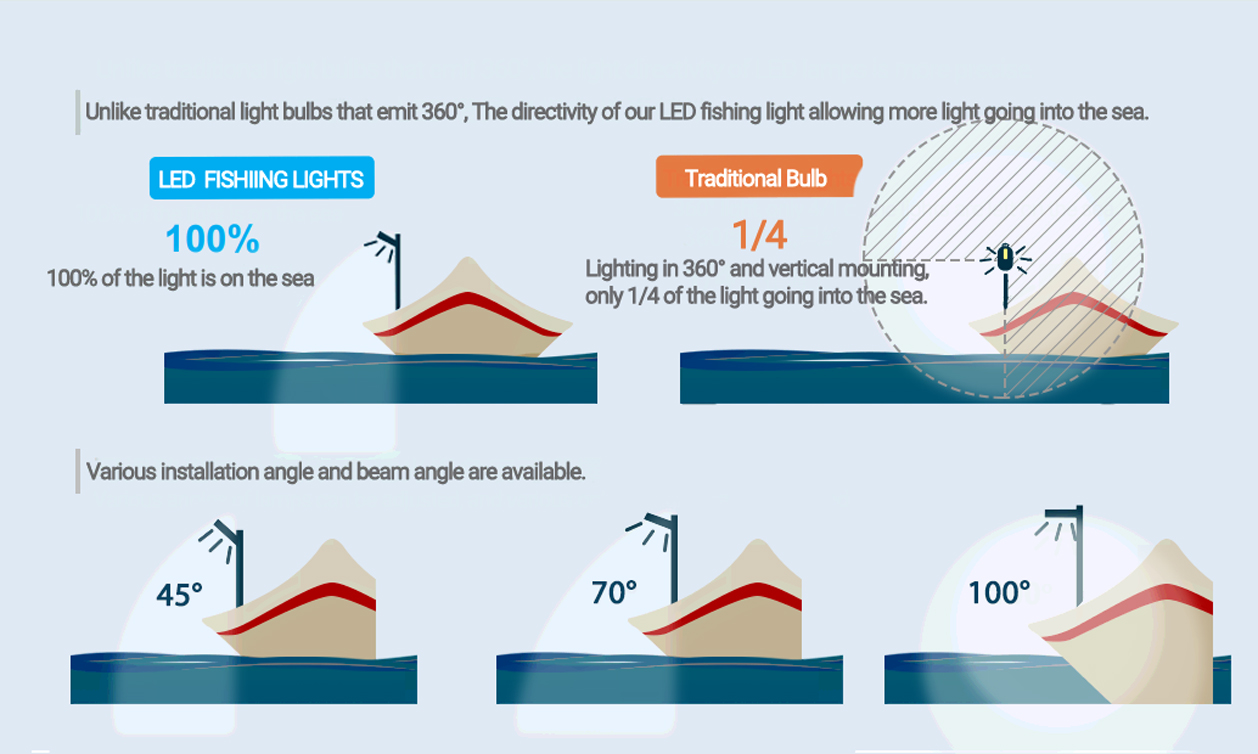 | Traditional Metal Halide Bulb lights | Other LED Overhead fishing lights | K-COB Overhead fishing lightings | K-cob advantage |
